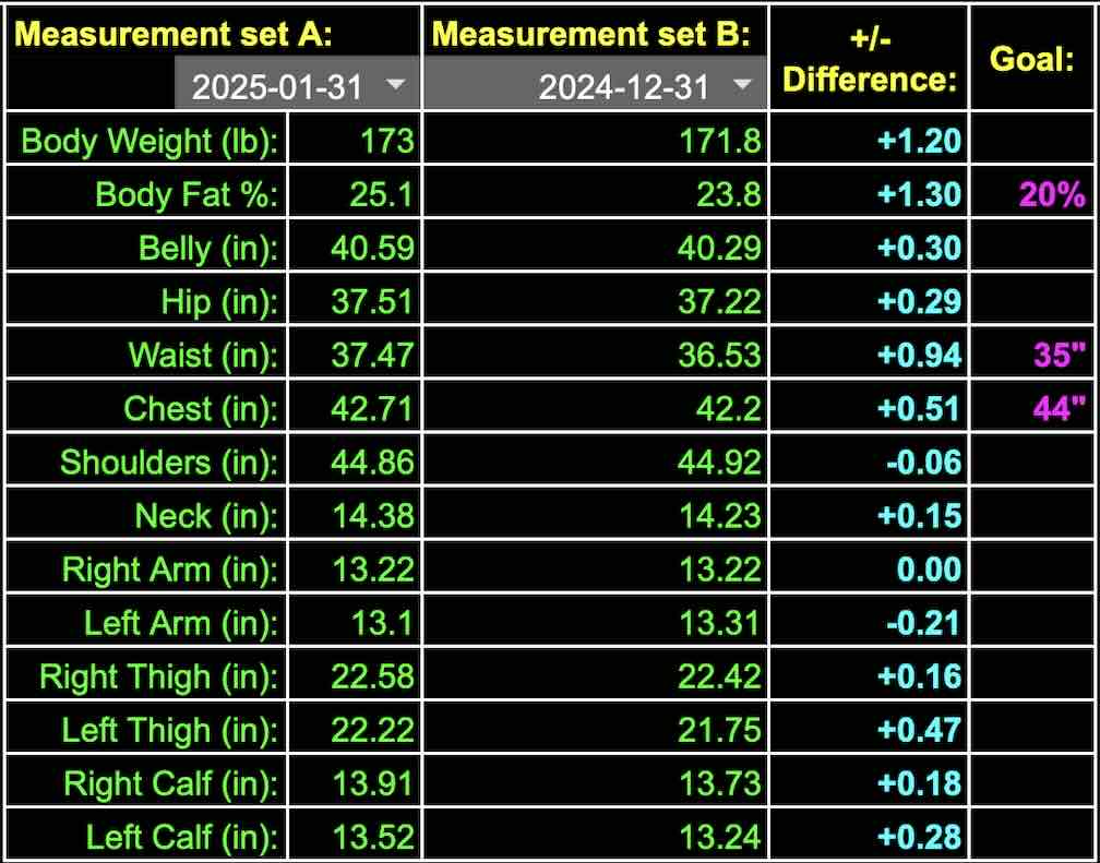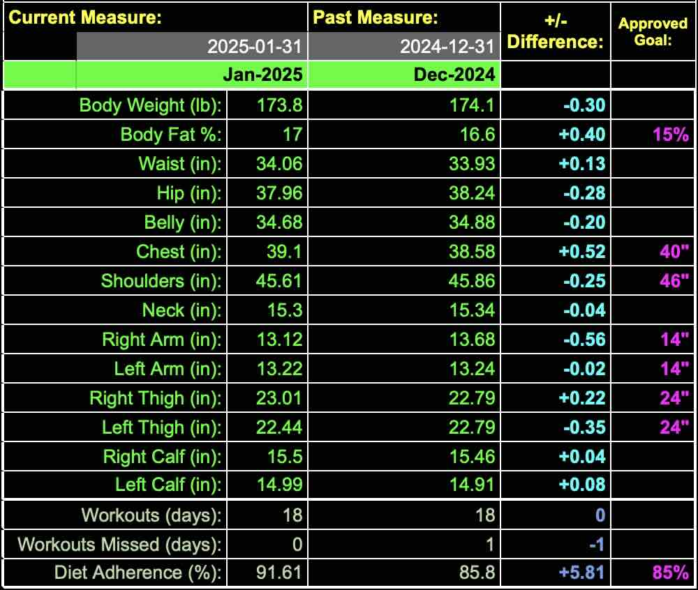 We recently posted the blog entry Health & Fitness as a Dynamic, which further describes how we have incorporated BDSM into our health and fitness dynamic. Each month, boy s37 will post combined results based on the goals that Sir Zuegi has approved. The following are results reported for January 2025: