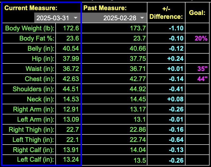 - Very flat results for March. This boy is proposing an increase in the number of weekly pushups as well as improved cardio work in April. # of days on diet adherence also needs improvement.