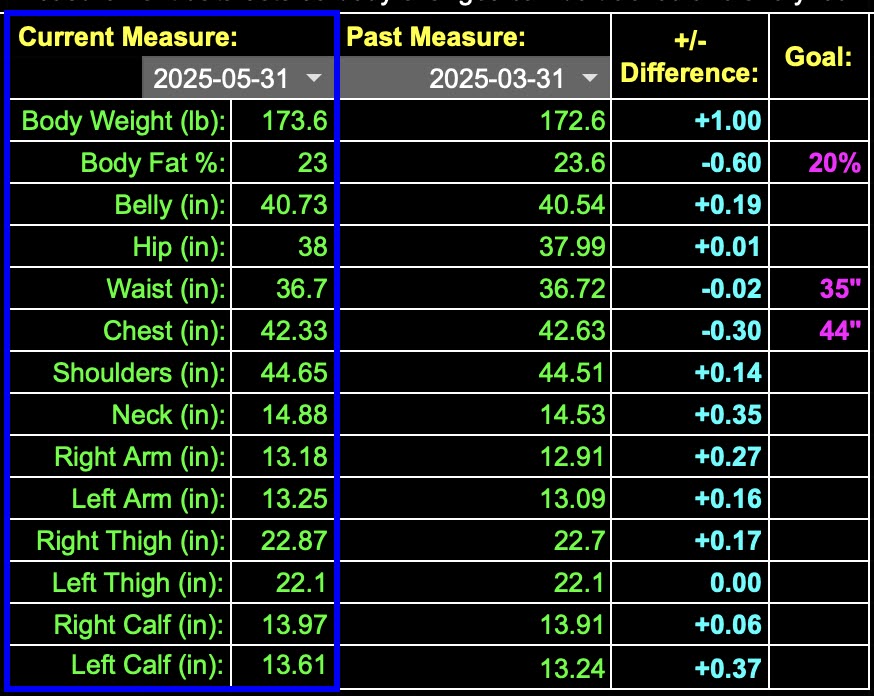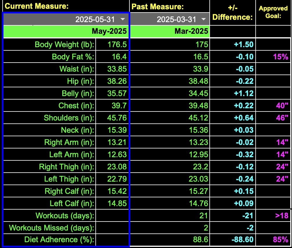- Decrease in BF% with a slight increase in weight shows continued muscle mass development.