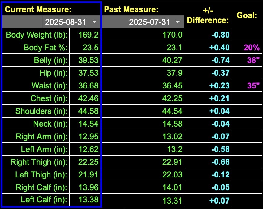 - I will build a more muscular physique and eat a balanced diet to maintain good health and physical form. A measurable goal of a 35 in waist, a 38″ belly and a targeted body fat percentage of 20%. >> Decrease in weight, (.8lb), decrease in belly (.74″), increase in waist (.23″), and increase in body fat % (.4).