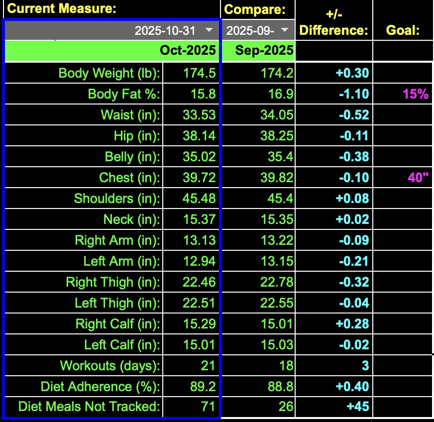 - October target – boy will continue to track his diet and only not track meals approved by Sir including during travel >> Your boy continued to diet track, and delivered a 89.2% diet adherence for October. Your boy had 71 meals not tracked in October (all approved by You Sir).
